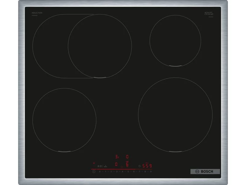 Indukciós üvegkerámia főzőlap - Serie6 - Home Connect & Hob-Hood Control - 60cm - Keretes kivitel - 4 indukciós főzőzóna, ebből egy bővíthető sütőzóna - DirectSelect - Timer, jelzőóra - Szüneteltetés funkció - ReStart - QuickStart - PowerBoost minden zónához - Power Management - 7,4kW max. teljesítmény - 2 fázisra köthető
