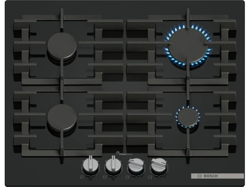 Gázfőzőlap - fekete edzett üveglap - Serie6 - 60cm - 4 gázégő - FlameSelect - elektromos szikragyújtás - automatikus gázelzárás - öntöttvas edénytartó rács (mosogatógépbe rakható) - könnyen tisztítható - levehető fém kezelőgombok