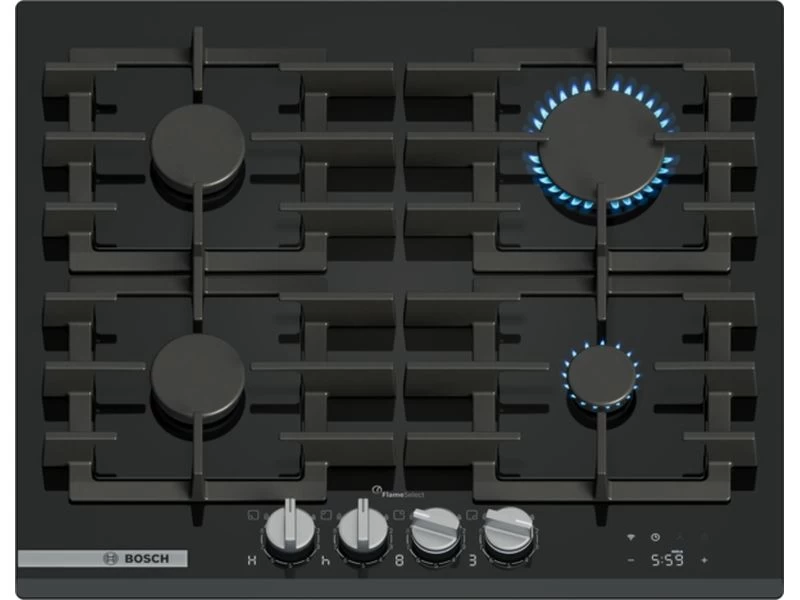 Gázfőzőlap - fekete edzett üveglap - Serie8 - Home Connect & Hob-Hood Control - 60cm - 4 gázégő - FlameSelect - Digitális kijelző időzítéssel - elektromos szikragyújtás - automatikus gázelzárás - öntöttvas edénytartó rács (mosogatógépbe rakható) - könnyen tisztítható - levehető, megvilágított fém kezelőgombok