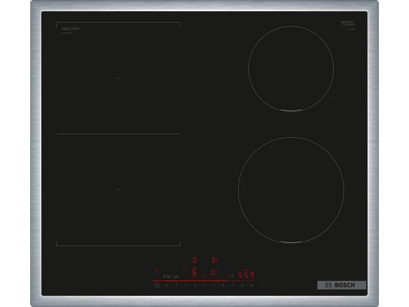CombiInduction üvegkerámia főzőlap - Serie6 - Home Connect & Hob-Hood Control - 60cm - Keretes kivitel - 4 indukciós főzőzóna, ebből 2 összekapcsolható CombiInduction zóna - DirectSelect - Timer, jelzőóra - Szüneteltetés funkció - ReStart - QuickStart - PowerBoost minden zónához - Power Management - 6,9kW max. teljesítmény - 2 fázisra köthető