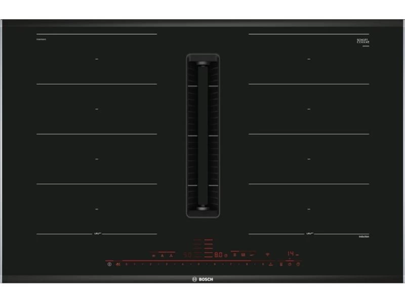 FlexInduction üvegkerámia főzőlap beépített páraelszívóval - 2. generáció - Serie8 - Home Connect - 80cm - Komfort-Profil - DirectSelect premium - két automatikus FlexInduction zóna - PerfectFry sensor - PerfectCook ready - beépített páraelszívó 620m3/h teljesítménnyel - PerfectAir sensor - automatikus elszívás - 7,4kW max. teljesítmény