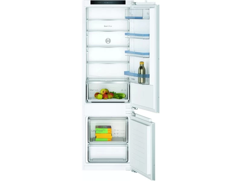 Beépíthető kombinált hűtő/fagyasztó - Serie4 - Laposzsanér - LowFrost - 200+70 l nettó űrtartalom - 177,5x56x55cm - Energiaosztály: E - LED kijelző - elektronikus vezérlés - LED világítás - VitaFresh XXL páratartalom-szabályzással- szuperfagyasztás