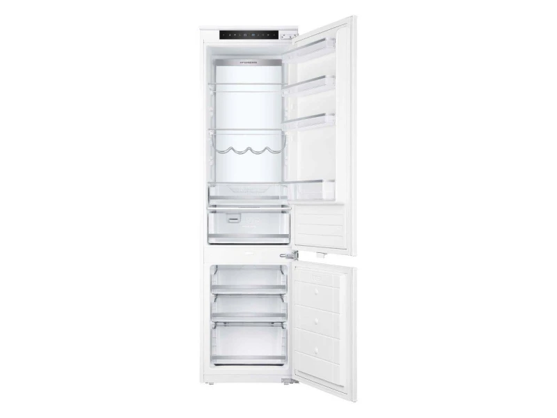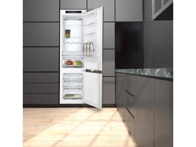 kombinált, alulfagyasztós beépíthető hűtőszekrény NO-FROST technológiával, LED világítás, 194 cm magas, 281 literes, 225 literes normál hűtőrész, 56 literes fagyasztó, elektronikus hőmérséklet szabályozás kijelzéssel, 3 db biztonsági üvegpolc, 4 db polc az ajtón, 1 db zöldségtartó fiók páratartalom szabályzással, 1 db 0 °C-os fiók, 1 db palacktartó fém polc, 3 db fagyasztó fiók, fogyasztás: 206 kWh/év, fagyasztó kapacitás: 2,6 Kg/24 óra, zajszint: 41 dB(A), megfordítható ajtónyitás
