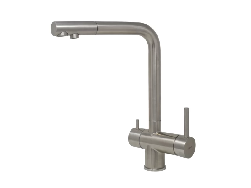 Egykaros álló csaptelep, két elosztó szeleppel, kerámiabetéttel, oldalsó szabályzókkal, elforgatható kifolyócsővel, víztisztító rendszerekhez is alkalmazható.