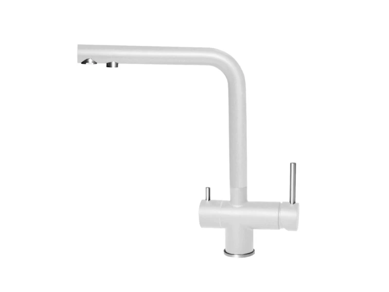 Egykaros álló csaptelep, két elosztó szeleppel, kerámiabetéttel, oldalsó szabályzókkal, elforgatható kifolyócsővel, víztisztító rendszerekhez is alkalmazható.