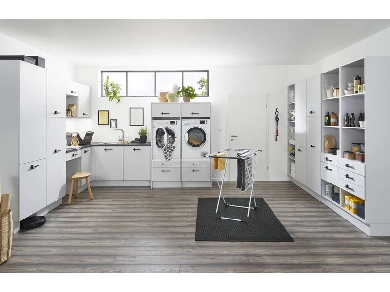 - Valamennyi alsószekrény lábakkal rendelkezik, újrahasznosítható, ütés- és nedvességálló műanyagból, állítócsavarral a magasság beállításához.