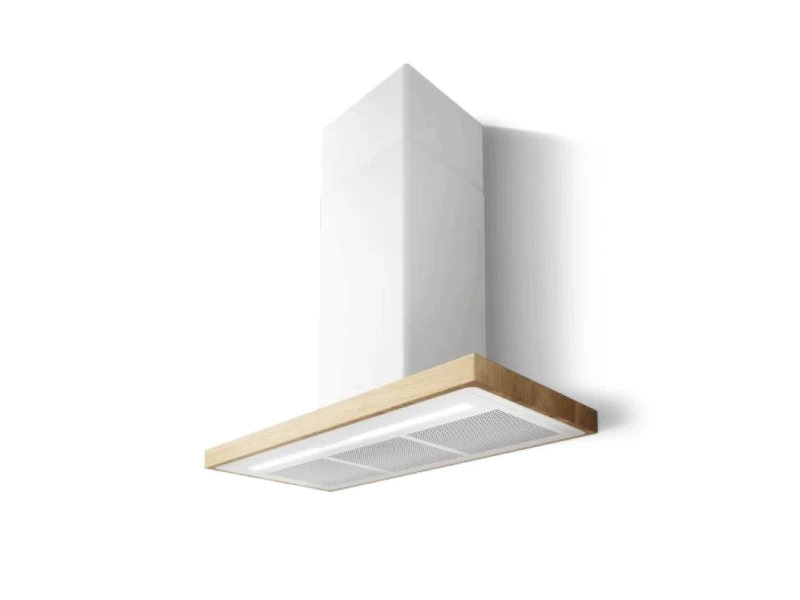 Egyedi kialakítású, fali páraelszívó, amit a tölgyfával kombinált fehér vagy fekete matt felület különböztet meg.