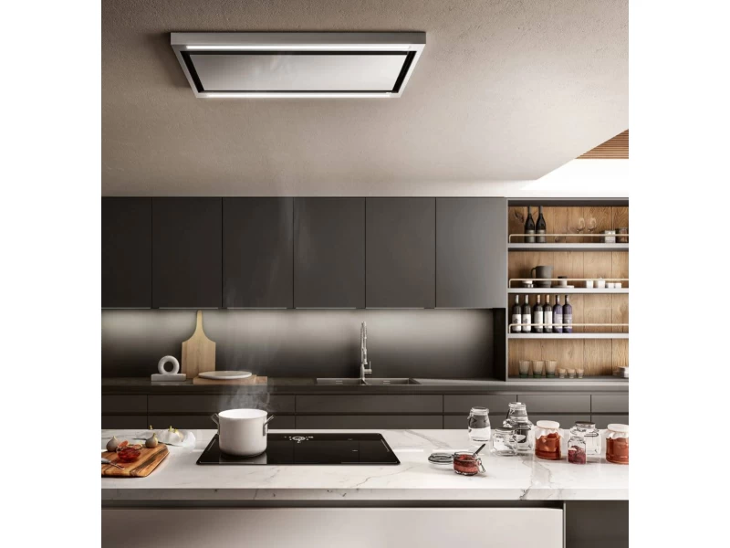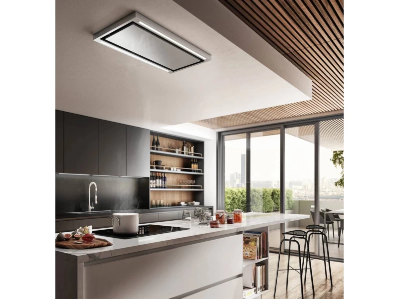 Hatékony mennyezeti páraelszívó minimalista kialakítással, amely könnyedén és diszkréten magasodik a főzőtér fölé.