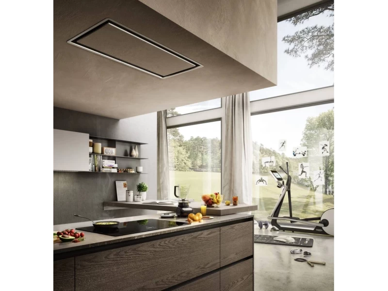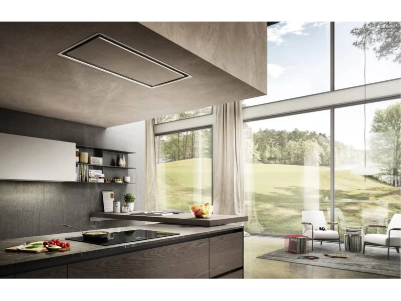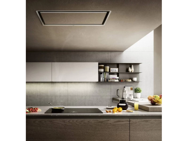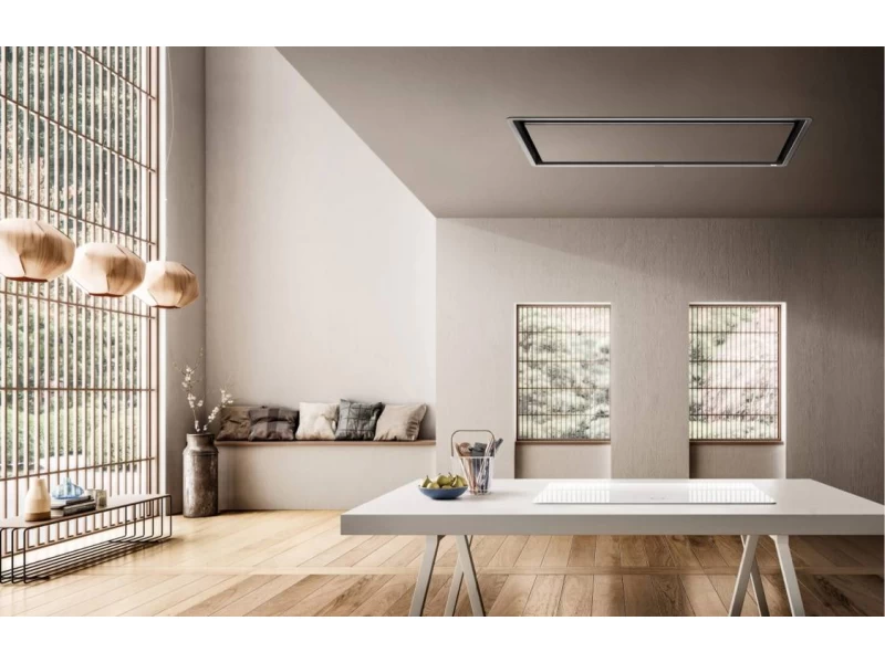 A mennyezettel egy szintben, ez a páraelszívó tökéletesen beleolvad a környezetébe. A projekt elrejti a szívórendszert, amely önmagában aktiválódik, beállítható és leállítható. Vagy az alkalmazás és a hangasszisztens segitségével.