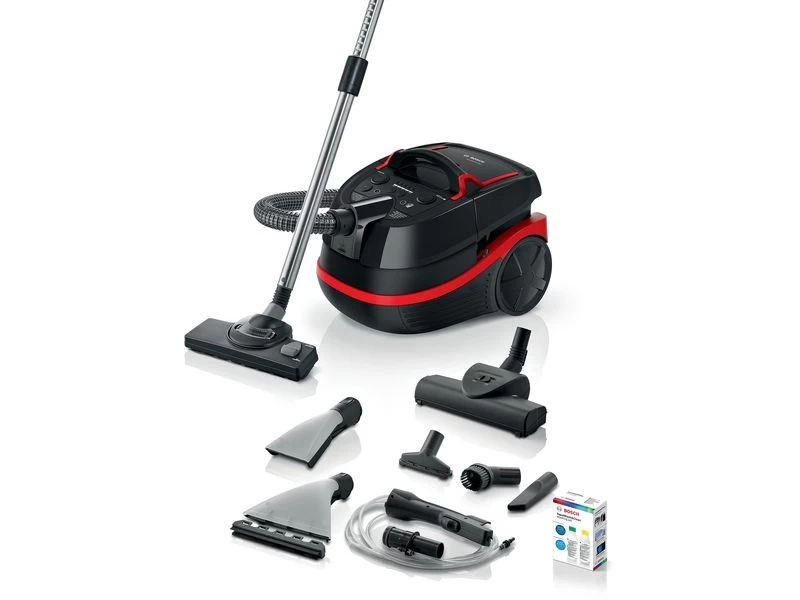 Takarítógép - 2100 W - HEPA H13 szűrő - szőnyegtisztító fej, kárpittisztító fej, átkapcsolható görgős szívófej, résszívó, bútorkefe, kárpitszívó, turbókefe, tisztítószerszett - 12 m hatósugár - piros/fekete