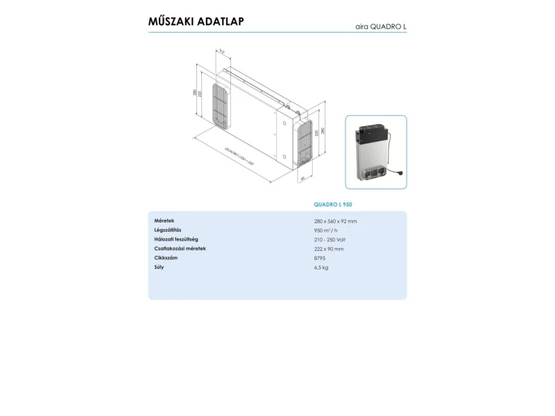 Az AIRA QUADRO L plazma szűrő alkalmas minden pultba építhető páraelszívóhoz, legyen az akár főzőlappal kombinált is. A QUADRO plazma szűrő kifejezetten ezekhez az elszívókhoz lett kifejlesztve. A legmagasabb teljesítményt nyújta minimális helyigény mellett. A QUADRO L plazma szűrőt az alsó szekrényben lehet elhelyezni. Amint bekapcsolja az elszívót, a beépített elektronikus érzékelő automatikusan bekapcsolja a plazma szűrőt (1 m/sec sebességgel) és azonnal megkezdi a levegő szűrését. Amint kikapcsolja az elszívót, a plazma szűrő is lekapcsol. (0,5W fogyasztás készenléti üzemmódban).