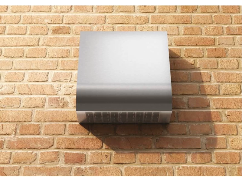 A 450x450x215 mm-es, inox kivitelű ház modern, időtálló megjelenést kölcsönöz a motoregységnek, amely tökéletesen illeszkedik a külső homlokzathoz. A rozsdamentes acél anyag hosszú élettartamot és kiváló ellenállóságot garantál az időjárási hatásokkal szemben. Az elhelyezés módja – a külső falra szerelés – biztosítja, hogy a zajforrás a házon kívül maradjon, miközben a motor esztétikusan, szinte észrevétlenül illeszkedik az épület külső környezetébe.