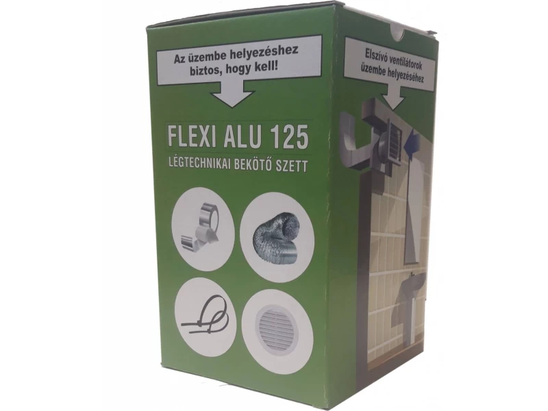 3 méter 125 mm átmérőjű flexibilis ALU cső, 2 db rögzítő bilincs, 2 db légtechnikai rögzítő szalag, 1 db 125 mm átmérőjű kerek fix rács