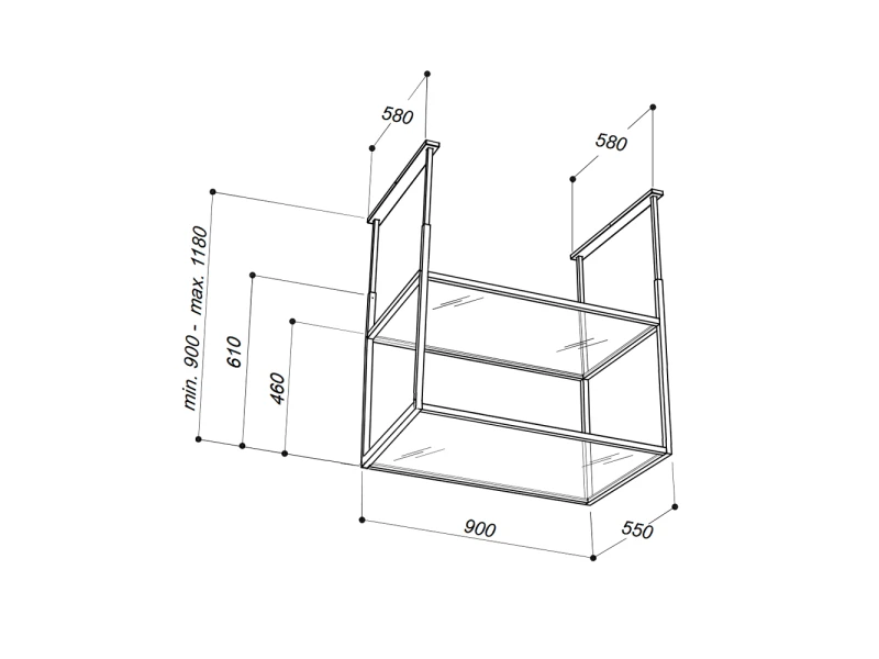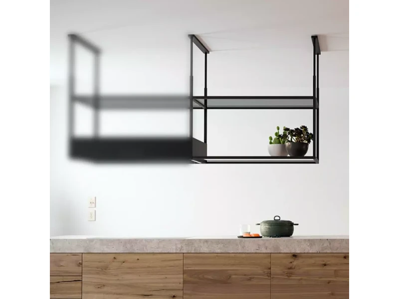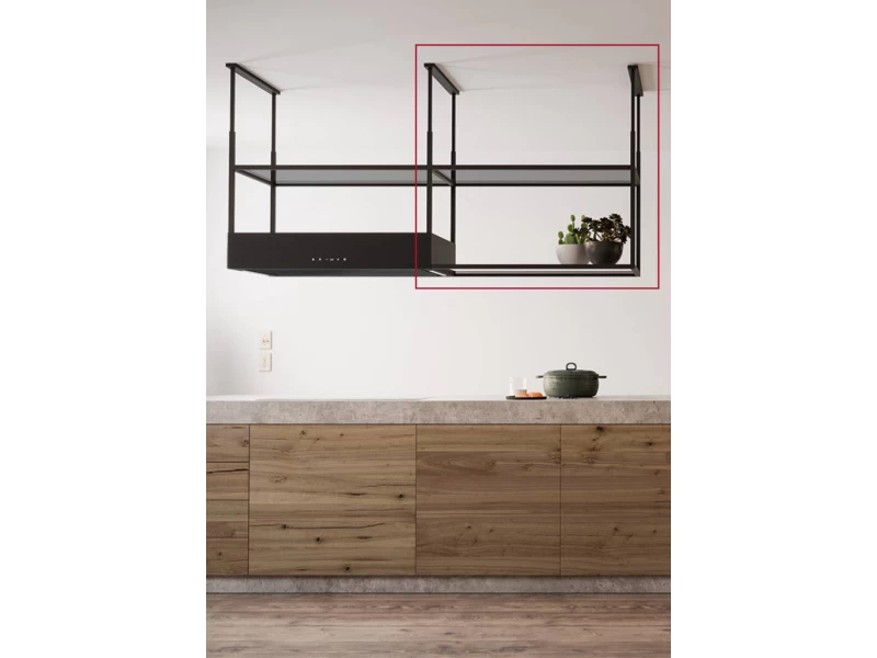 A két üvegpolcból álló kiegészítő rész fekete fém keretben kapott helyet, amely egyszerre biztosít stabil tartást és esztétikus megjelenést. Az füstös üvegfelületek elegáns hatást keltenek, miközben a masszív fémkeret hosszú távú megbízhatóságot nyújt. A modul kialakítása kifejezetten a sziget elszívó formai sajátosságaihoz igazodik, így a teljes egység harmonikusan illeszkedik a konyha központi terébe.